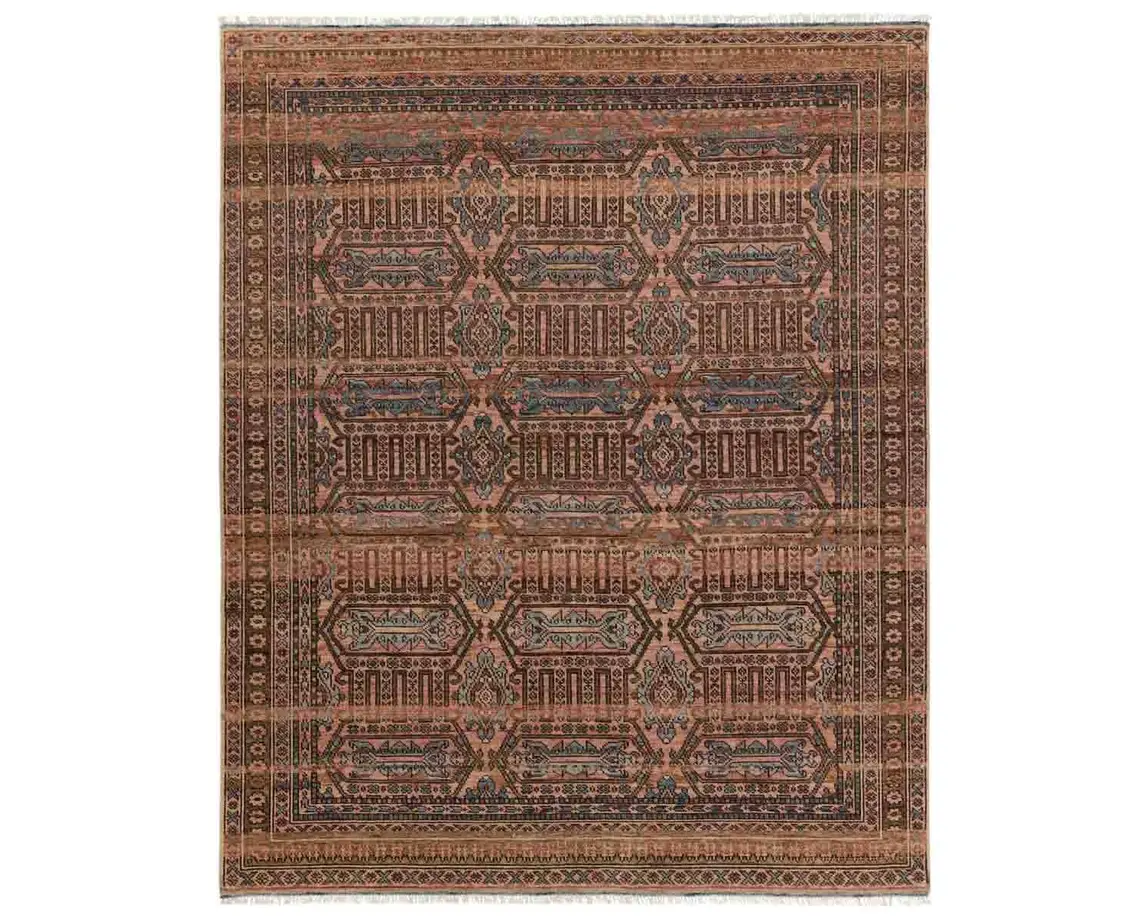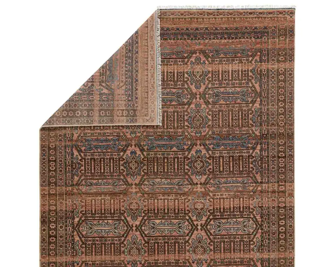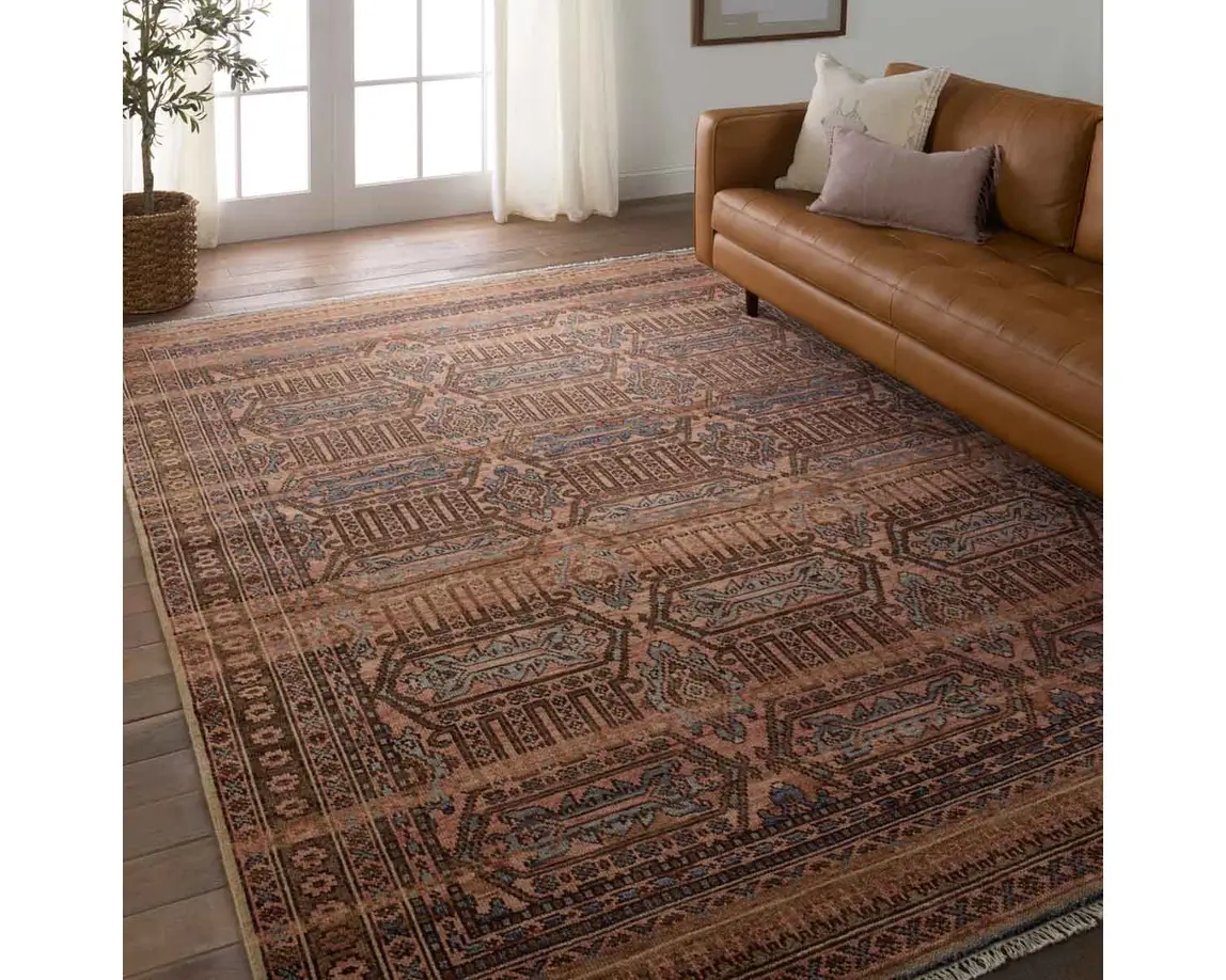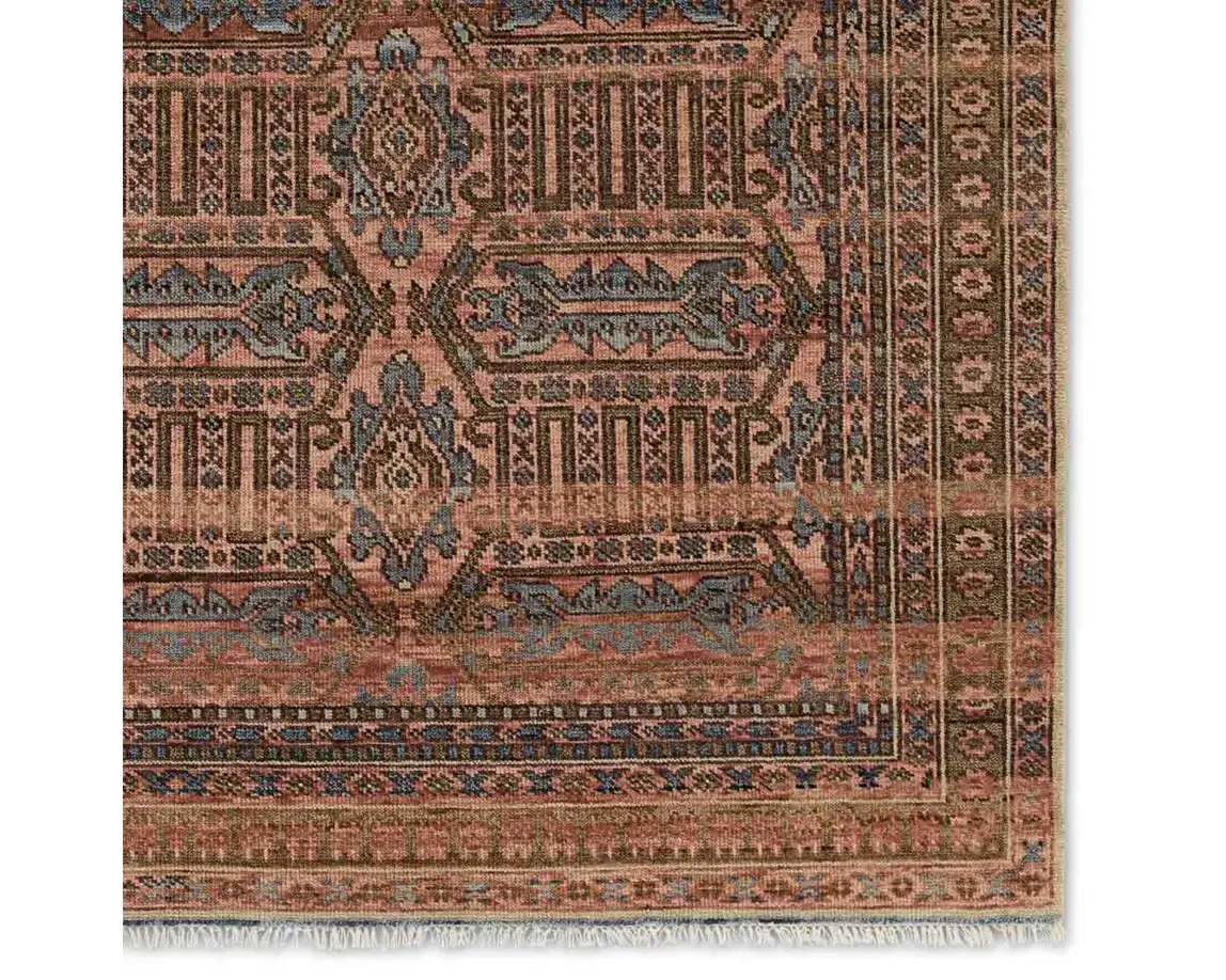 The Liberty collection infuses homes with traditional design and exceptional artisan-made accents. The hand-knotted Leone rug showcases mini-medallions with tribal detailing. Pink, brown, and beige tones ground this durable wool rug, while the blue pattern pops for a global look.