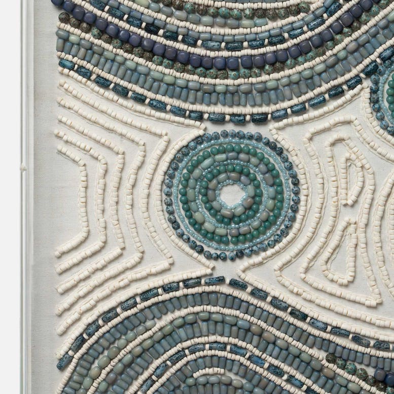 In an abstract interpretation, various hand-applied beads are placed in captivating swirls on a cream background evoking the sparkle of the sun on the morning waves.